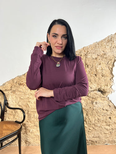 Maglia basic manica lunga e scollo tondo. Composizione 95% cotone, 5% elastane. Il capo ha una vestibilità fino a una taglia 48 (vedi tabella taglie). Alessandra veste una taglia 44 ed è alta 1.65. Prodotto in Italia.