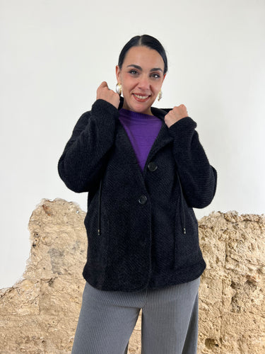 Giubbotto sfoderato con cappuccio e bottoni. Alessandra è alta 1,65cm ed è tg 44 il capo ha una vestibilità fino tg 46. Composizione: 85%poliestere 10%viscosa 5%elastan. Fabbricato in Italia.