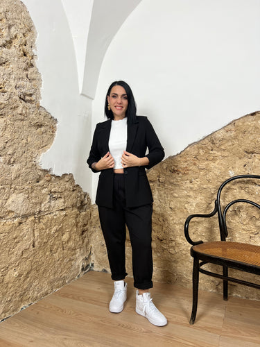 Tailleur composto da Blazer manica tre quarti e pantalone con elastico in vita, tessuto elasticizzato. Composizione 65% viscosa, 30% nylon, 5% elastane. Il capo ha una vestibilità fino a una taglia 48 (vedi tabella taglie). Alessandra veste una taglia 44 ed è alta 1.65. Prodotto in Italia.